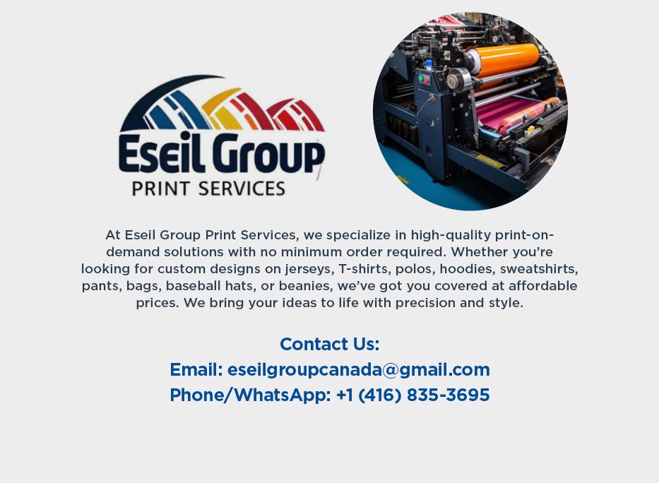 At Eseil Group Print Services, we specialize in high-quality print-on-demand solutions with no minimum order required. Whether you're looking for custom designs on jerseys, T-shirts, polos, hoodies, sweatshirts, pants, bags, baseball hats, or beanies, we’ve got you covered at affordable prices. We bring your ideas to life with precision and style.